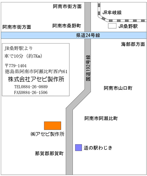 【本社】 〒779-1404 徳島県阿南市阿瀬比町西内61番地 TEL.0884-26-0889 FAX.0884-26-1506 E-mail.asebiss@asebi.net ■案内:国道195 号線沿い、道の駅わじきの100m 徳島寄りにあります。